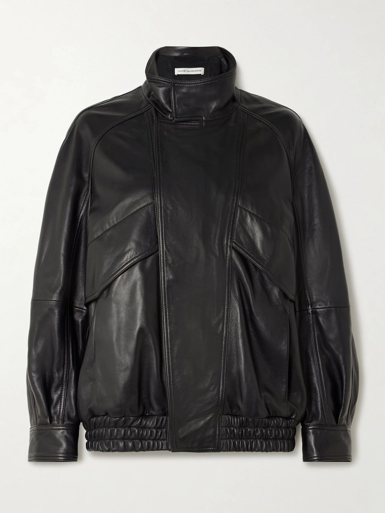 Nour Hammour’s ‘Ariste’ jacket exudes effortless cool with its oversized cut and understated edge. It's made from panels of supple leather and has an elasticated hem and concealed placket. The full lining ensures smooth layering. Lower-Impact Materials. This product is made using at least 50% lower-impact materials or ingredients. Find out more about our NET SUSTAIN criteria here. Size & Fit - Intended to be oversized; we recommend sizing down if you prefer a closer fit - Elasticated at the hem - Supple, non-stretchy leather - Model is 180cm/ 5'11" and is wearing a size XSmall Model measurements: - Bust: 80cm/ 31.5" - Waist: 65cm/ 25.5" - Hip: 89cm/ 35" Details & Care - Black leather - Concealed snaps and zip fastening at front - 100% leather (Lamb); lining1: 63% cupro, 37% viscon; lining2: 100% silk - Fully lined - Specialist clean - By purchasing this product, you are supporting responsible leather manufacturing through Leather Working Group.