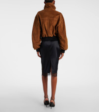 The Briar bomber jacket from Nour Hammour is crafted from premium suede, reflecting the brand's signature artisanal heritage. Its style is finished with elasticated hems and cuffs and a foldable collar. Product Details - Material: 100% goat leather (suede) - Care instructions: specialist clean - Made in Turkey - Designer color name: Camel Suede - Item color: brown - Lining: 100% rayon - Hardware color: silver - Closure: zipper, snap-button fastenings - Collar: turtleneck - Pockets: angled chest pockets - Cuff: ribbed, elasticated - Hem: ribbed, elasticated - Fully lined - Item number: P01060708 Size & Fit - True to size - Dropped shoulders - Cinched waist - Elasticated hem - Non-stretchy fabric - Falls to the hip - The model seen in the picture is 178cm-5'10" and wearing a size XS