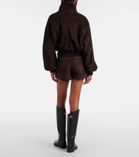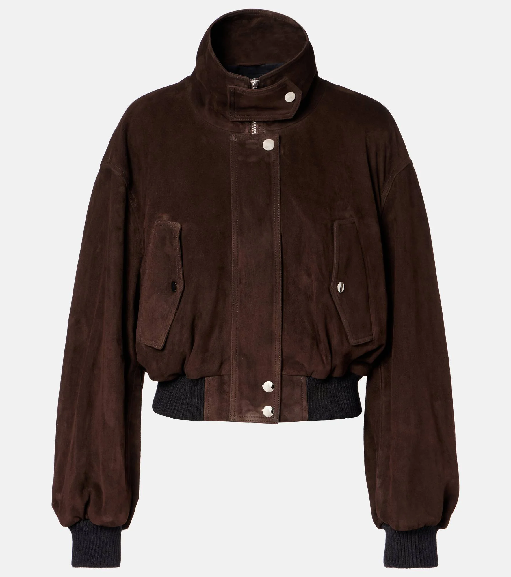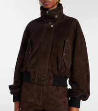 The Briar bomber jacket from Nour Hammour is crafted from premium suede, reflecting the brand's signature artisanal heritage. Its style is finished with elasticated hems and cuffs and a foldable collar. Product Details - Material: 100% goat leather (suede) - Care instructions: specialist clean - Made in Turkey - Designer color name: Mocha Suede - Item color: brown - Lining: 63% cupro, 37% viscose - Sleeve lining: 100% silk - Hardware color: silver - Closure: zipper, snap-button fastenings - Collar: turtleneck - Cuff: ribbed, elasticated - Pockets: angled chest pockets - Hem: ribbed, elasticated - Fully lined - Item number: P01060710 Size & Fit - True to size - Dropped shoulders - Cinched waist - Elasticated hem - Non-stretchy fabric - Falls to the hip - The model seen in the picture is 178cm-5'10" and wearing a size XS