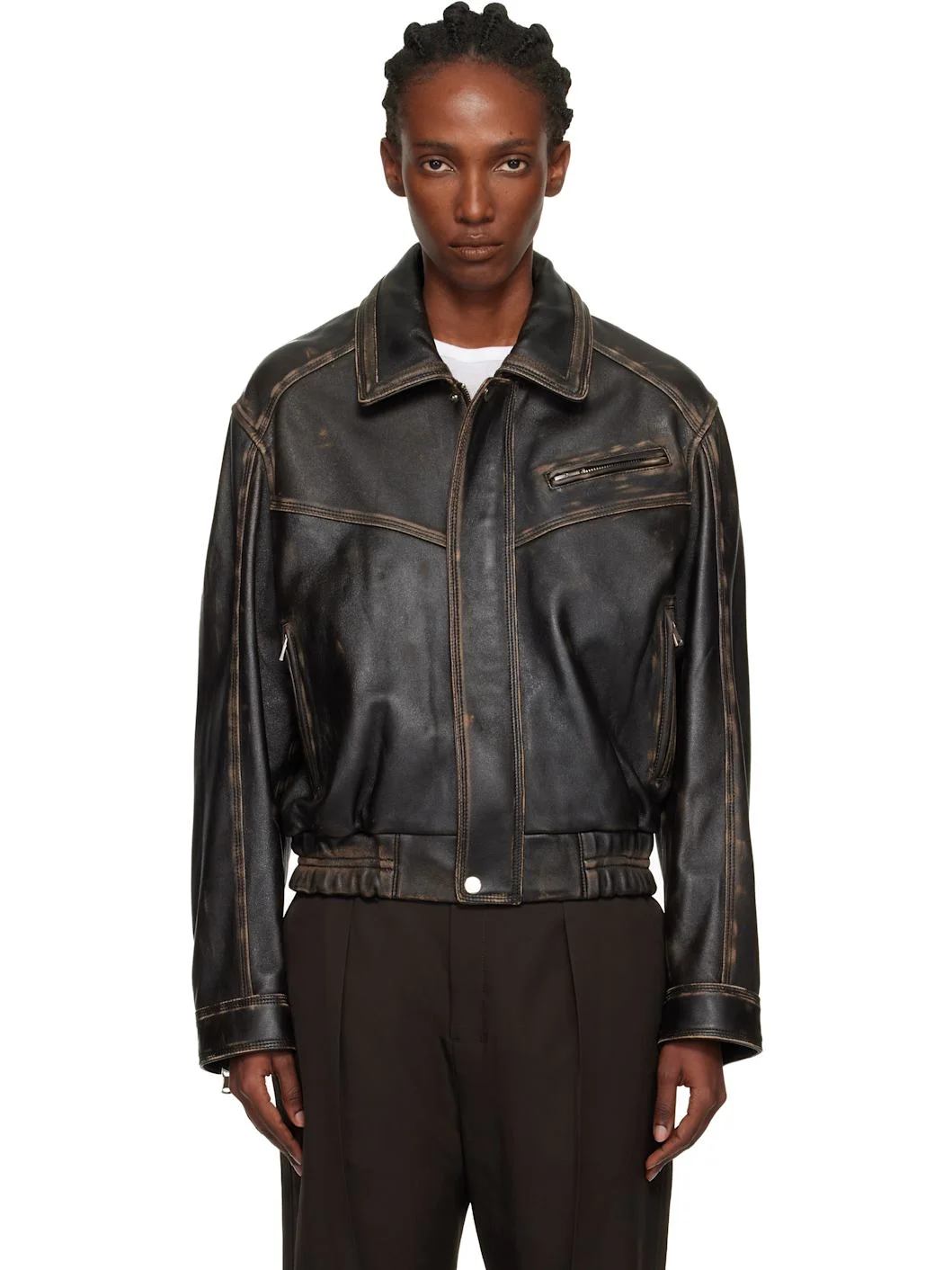 Grained lambskin bomber jacket. · Fading throughout · Spread collar · Zip closure with press-stud placket · Zip pockets at front · Elasticized cropped hem · Saddle shoulders · Zip vent at cuffs · Full plain-woven lining Supplier color: Vintage brown Body: 100% lambskin. Lining: 63% cupro, 37% viscose. Made in Turkey 252306F064025