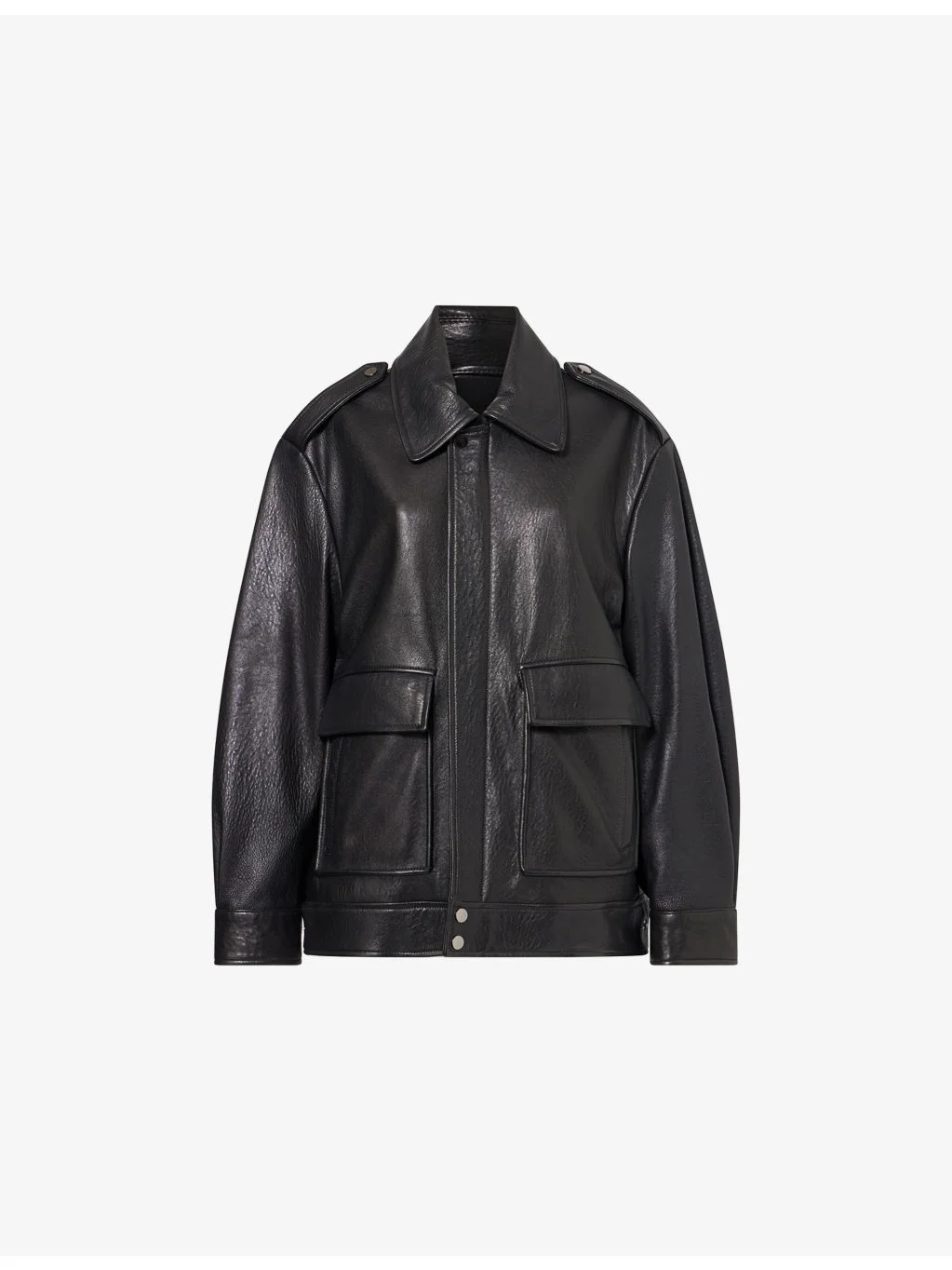 PRODUCT DETAILS - Nour Hammour leather jacket - 100% lamb leather; lining 63% cupro, 37% viscose - Exposed zip fastening at front - Oversized fit, pointed collar, shoulder tabs, long sleeves, press-stud cuffs, two front flap pockets, silver-toned hardware - Specialist leather clean - Made in Turkey - True to size - Size small: length 27.5in / 70.5cm - Model is 5ft 10in/1.78m and wears a size small - Midweight, non-stretch Ref: R04585684