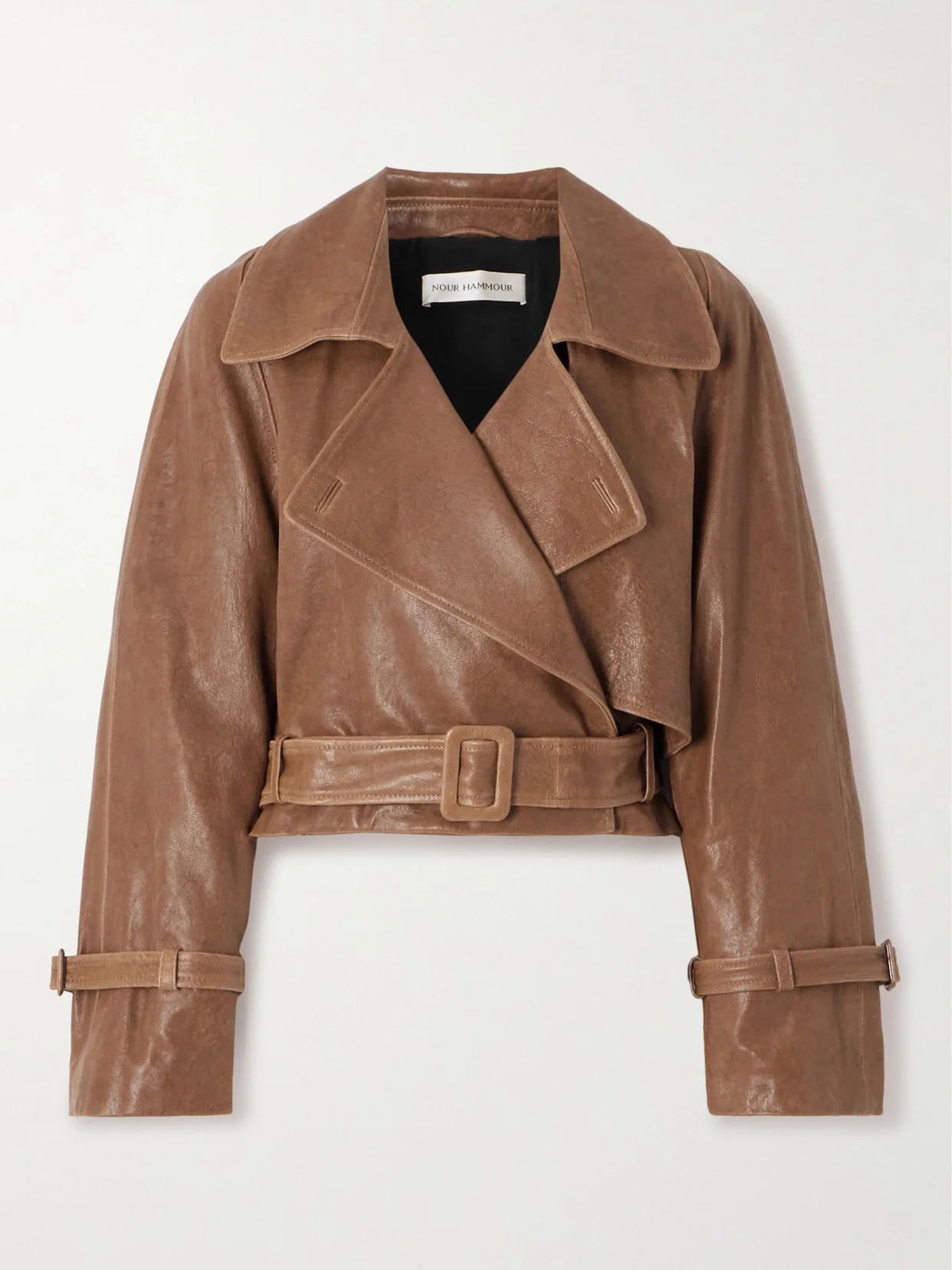 Nour Hammour's 'Hatti' jacket has been made in the brand's Parisian atelier from leather that'll soften beautifully over time. It has wide lapels and a buckled belt threaded through the cropped hem. Lower-Impact Materials. This product is made using at least 50% lower-impact materials or ingredients. Find out more about our NET SUSTAIN criteria here.