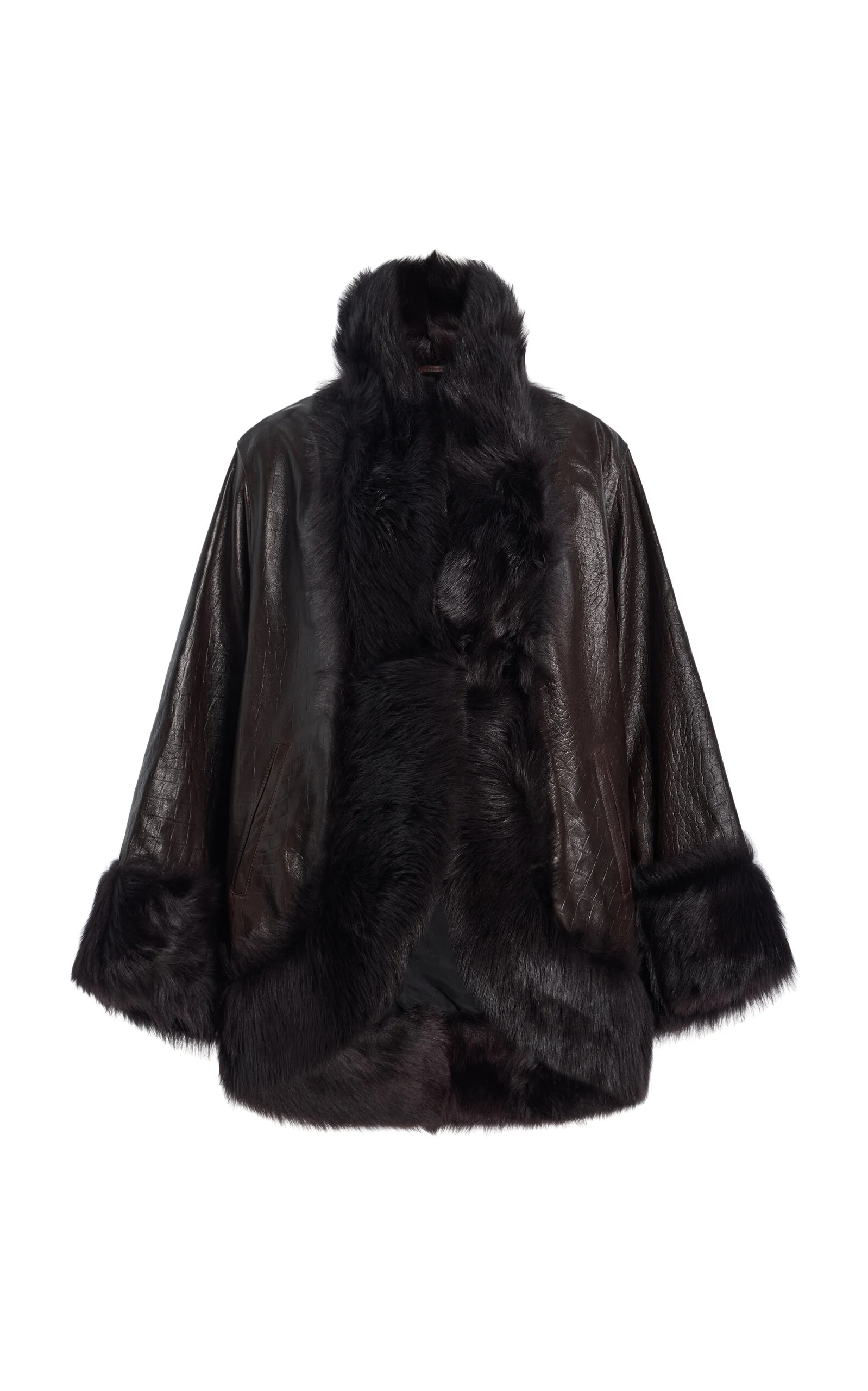 Nour Hammour’s artisanal focus on luxury outerwear secures its place as favorite amongst fashion enthusiasts worldwide. The Female-led brand has gone on to empower women not only through their designs and silhouettes, but through their practices. A decadent jacket in croco-embossed leather, trimmed in plush shearling. Defined by a voluminous silhouette with dropped shoulders and wide sleeves. Fastens with discreet hooks or wear open for ease. PRODUCT DETAILS - Resort ‘26 - Hook fastening - Composition: 100% Lambskin Leather; Trim: 100% Lambskin Shearling - Specialist clean - Imported