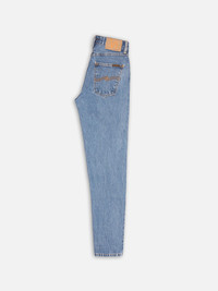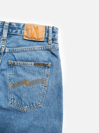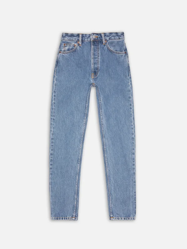 High-waist regular-fit jeans with a tapered leg in a superb mid-blue stonewash. Made from organic cotton. Size & Fit Model is wearing size: W26’’L30'' Model's height: 176 cm / 5’9’’ Details - Organic cotton - 14.9 oz. rigid denim - Tobacco threads at seams - Silver trims - Button fly - Jacron Patch - Regular fit - High waist - Tapered leg - Slim leg opening 100% Cotton Made in TN High-waist regular-fit jeans with a tapered leg in a superb mid-blue stonewash. A spot-on classic right? No wonder, because these jeans are made from one of our absolute favorite denim fabrics. Constructed from ring and open-end yarns washing renders a 90s-centric marble texture. And the pure indigo-dyed warp renders that utterly beautiful brilliant blue hue.
