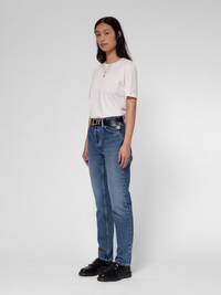 High-waist regular-fit jeans with a tapered leg in a mid-blue wash with bright contrasts. Made from organic cotton. Size & Fit Model is wearing size: W26''L30'' Model's height: 175 cm / 5'8'' Details - Organic cotton - 14.9 oz. rigid denim - Tobacco threads at seams - Copper trims - Button fly - Jacron Patch - Regular fit - High waist - Tapered leg - Slim leg opening 100% Cotton Made in TN High-waist regular-fit jeans with a tapered leg in a mid-blue wash with bright contrasts. It is rustic yet refined - the balance between calm abraded areas and the lively marble effects. It's super clean yet worn - the brilliant blue hues and the oh-so-slight warmth over the abraded areas. It is all in the details and these Day Dreamers are full of them.
