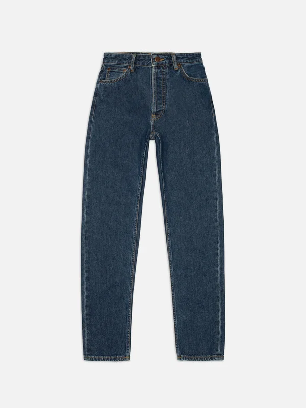 Details - Organic and recycled cotton - 12.75 oz. rigid denim - Tobacco threads at seams - Copper trims - Button fly - Jacron Patch - Regular fit - High waist - Tapered leg - Slim leg opening High-waist regular-fit jeans with a tapered leg in a soft, dark blue stonewash. The wash displays a wonderful blend of textures and muted dark indigo hues. Seams provide a highlighting detail, and a subtle marbling texture adds depth and further detail, giving this plain stonewash the authentic, deep indigo stonewashed look of the '00s.