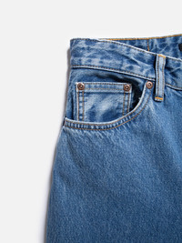 Loose-fit jeans with a wide leg and high waist in a superb mid-blue stonewash. Made from organic cotton. Size & Fit Model is wearing size: W26" L32" Model's height: 174 cm / 5’8” Details - Organic cotton - 14.9 oz. rigid denim - Tobacco threads at seams - Silver trims - Zip fly - Jacron patch - Loose fit - High waist - Wide leg - Wide leg opening 100% Cotton Made in TN Loose-fit jeans with a wide leg and high waist in a superb mid-blue stonewash. A spot-on classic right? No wonder, because these jeans are made from one of our absolute favorite denim fabrics. Constructed from ring and open-end yarns washing renders a 90s-centric marble texture. And the pure indigo-dyed warp renders that utterly beautiful brilliant blue hue.