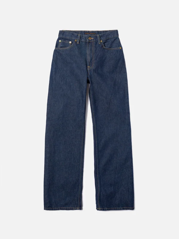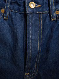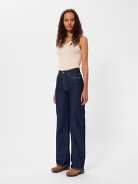 Loose-fit jeans with a wide leg and high waist in a classic blue wash. Size & Fit Model is wearing size: W26" L34" Model's height: 179 cm / 5’10” Details - Organic cotton - 13.5 oz. Rigid denim - Ochre threads at seams - Vintage-inspired brass metal trims - Zip fly - Jacron patch - Loose fit - High waist - Wide leg - Wide leg opening 100% Cotton Made in TN Loose-fit jeans with a wide leg and high waist in a classic blue wash. This wash may not be a full wash, its more of a rinse, but it's just enough to give these jeans an amazingly brilliant blue-blue indigo hue and an astonishing texture. Paired with ochre thread and vintage-inspired metal trims, these jeans are a delightful splash of indigo joy.