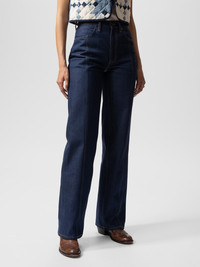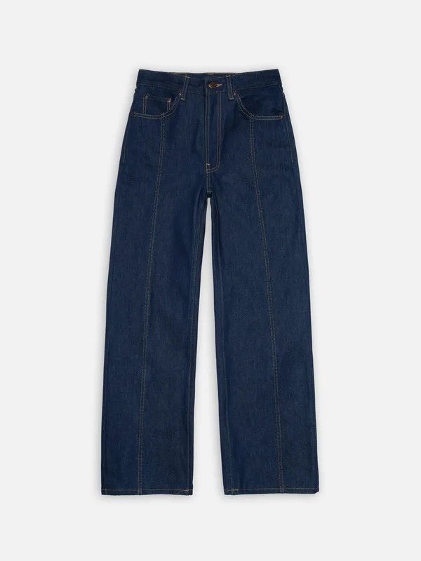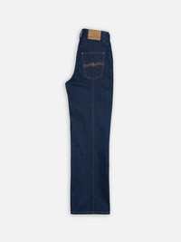 High-waist, regular-fit jeans with a tapered leg, featuring a distinctive detail: cantered felled seams along the front and back of the legs. These jeans feature a vibrant 60s-inspired blue wash, inspired by the simplicity of a single home wash of dry denim. Details - Organic cotton - 13.75 oz. rigid denim - Light tobacco threads at seams - Copper trims - Zip fly - Jacron patch - Loose fit - High waist - Wide leg - Wide leg opening 100% Cotton Made in TN High-waist, regular-fit jeans with a tapered leg, featuring a distinctive detail: cantered felled seams along the front and back of the legs. These jeans feature a vibrant 60s-inspired blue wash, inspired by the simplicity of a single home wash of dry denim. Crafted from denim with a vivid 60s indigo hue, the wash deepens the color from mid-blue to a richer, more saturated tone, while enhancing the texture for a fuller, softer feel. Striking from the start, these jeans are designed to evolve beautifully over time. With every wear and wash, they develop a vibrant, texturally rich vintage character. These jeans deliver both immediate charm and evolving beauty.