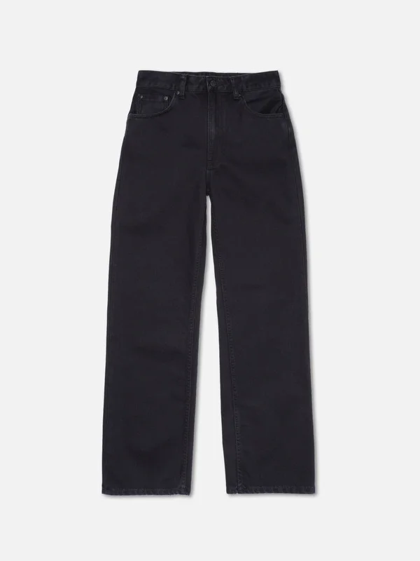 Loose-fit jeans with a wide leg and high waist in the ideal black wash. Size & Fit Model is wearing size: W26" L34" Model's height: 174 cm / 5’8” Details - Organic cotton - 13.9 oz. Rigid denim - Black thread at seams - Dull black metal trims - Zip fly - Jacron patch - Loose fit - High waist - Wide leg - Wide leg opening 100% Cotton Made in TN Loose-fit jeans with a wide leg and high waist in the ideal black wash. Crafted from a splendid black denim with a coarse texture, these jeans have been delicately washed to achieve a subdued black hue, accentuating the texture slightly and imbuing them with depth and intricate detailing. The addition of dull black rivets and buttons provides a clean black expression throughout the jeans.