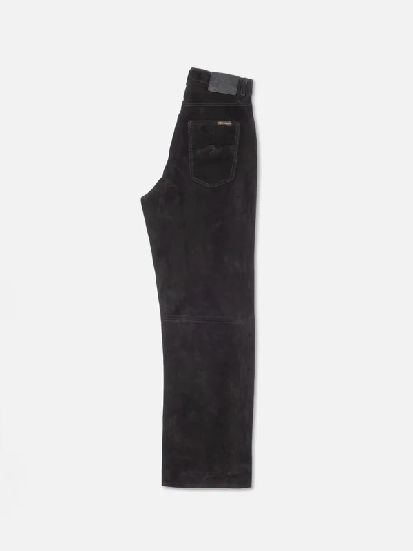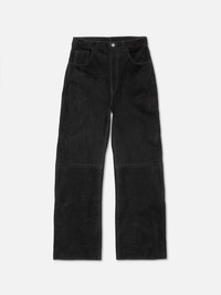 Loose-fit, wide-leg pants made in impeccably supple, jet-black goat suede leather. Size & Fit Model is wearing size: W28" Model's height: 175cm / 5’8” Details - Semi-vegetable tanned goat leather - Lining in recycled polyester - Black threads at seams - Stainless steel button - Gunmetal trims - Zip fly - Jacron patch - Loose fit - High waist - Wide leg - Wide leg opening - Due to the natural characteristics of this leather, the color may rub off onto fabrics and upholstery. 100% Leather Made in IN Pants rendered from an impeccably supple, jet-black goat suede leather. They have the same cut and trims as our denim version of this fit. The fit is loose with a wide leg and a high waist. The pants are lined with recycled polyester lining from the waist to the knee. For extra comfort it's woven in a way that makes it elastic. Please note that due to the natural characteristics of this leather, the color may rub off onto fabrics and upholstery. When you buy these pants, you can be sure we have paid our share of living wages.
