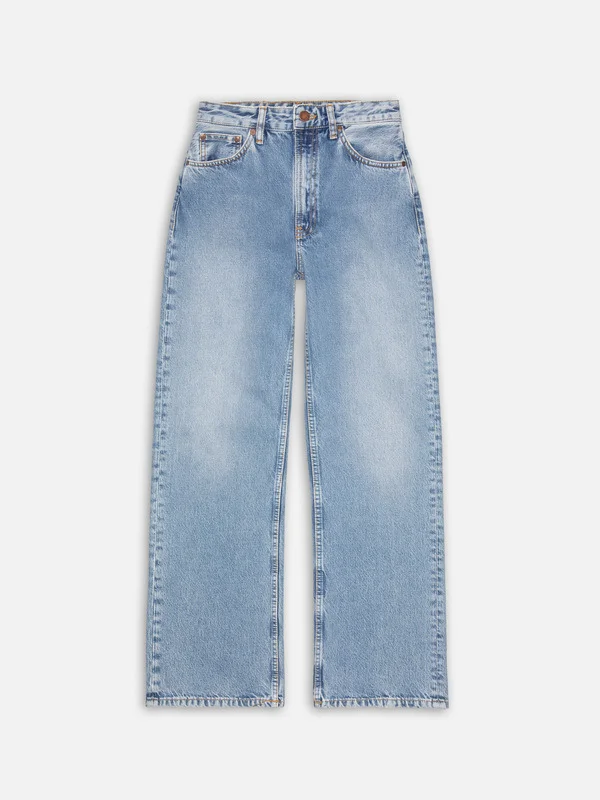 Loose, high-waist jeans with a wide leg in a vintage-like wash. Made from organic cotton. Size & Fit Model is wearing size: W26" L32" Model's height: 175 cm / 5’8” Details - Organic cotton - 14.9 oz. rigid denim - Tobacco threads at seams - Indigo back pocket embroidery - Copper trims - Zip fly - Jacron patch - Loose fit - High waist - Wide leg - Wide leg opening 100% Cotton Made in TN A loose, high-waist fit with a wide leg. This is a perfect display of what you’d get if you wore your favorite stonewashed jeans long enough. Clear blue and clean with authentic wear in all the right places. There are beautiful contrasts between marbled and flat areas with heaps of patina and defined twill lines.