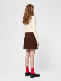 Supple goat suede skirt with a-line cut finished with off-white top stitches. Regular fit. Size & Fit Model is wearing size: S Model's height: 176cm / 5’9” Details - Semi-vegetable tanned goat leather - Lining in 50% recycled polyamide/50% organic cotton - Offwhite thread at seams - Silver trims - Regular fit 100% Leather Made in IN Skirt rendered from an impeccably supple goat suede leather in a rich chocolate brown shade. The fit is regular with a-line shape. It's lined with a quality that mixes recycled polyamide and organic cotton. Hems and edges are raw and finished with off-white top stitches. When you buy this skirt, you can be sure we have paid our share of living wages.