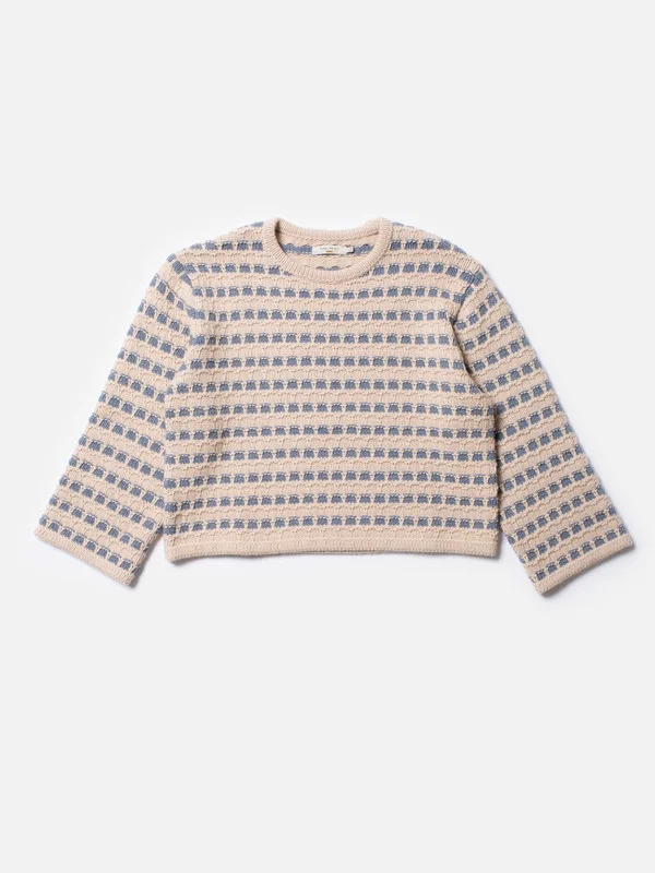 Crew neck sweater in two-colored knit with a 3D effect made with organic cotton and wool. Regular boxy fit. Size & Fit Model is wearing size: S Model's height: 177 cm / 5’9” Details - Organic wool - Organic cotton - Regular fit 55% Wool 45% Cotton Made in TR Crew neck sweater with a regular boxy fit made from a yarn mix with organic wool and cotton. This gives a light fabric with a very soft hand. The two-colored knit is made in a special technique that gives it a 3D effect where off-white purl stitches create a framework on top of the striped pattern.