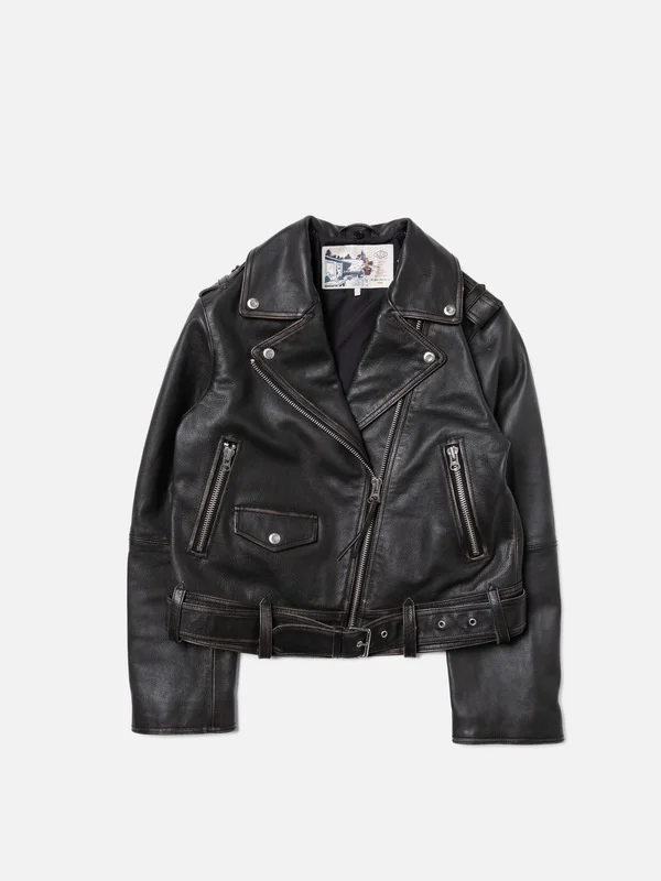 Biker jacket rendered from heavy buffalo leather with a detachable shearling collar. Regular fit. Size & Fit Model is wearing size: S Model's height: 176 cm/5,9" Details - Semi-veg tanned buffalo leather - Detachable shearling collar - Lining in recycled polyamide/organic cotton - One inside pocket - Silver metal trims - Regular fit 100% Leather Made in IN Biker jacket rendered from heavy buffalo leather. Greta has the neat fit and all the characteristic details of a classic biker jacket. It's fully lined with a black recycled polyamide and organic cotton lining. A garment wash gives the jacket a light, worn-in outlook. It's also finished with a wax treatment to really bring out the texture of the leather. Wear it with or without the detachable shearling collar. When you buy this jacket, you can be sure we have paid our share of living wages.