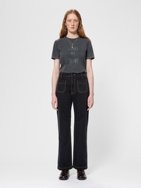 Details - Organic cotton - 13.9 oz. Rigid denim - Beige thread at seams - Vintage-inspired dull black button - Regular fit - High waist - Wide leg - Wide leg opening - Full-length inseam 100% Cotton Made in TN These pants are our take on western-style design. They feature a yokeless regular fit, offering a wide leg and a high waist, complete with front-facing patch pockets and press creases for precision. Crafted from exquisite black denim with a coarse texture, these pants have undergone a delicate washing process, resulting in a subdued black hue that subtly enhances the texture and adds depth and intricate detailing. The addition of beige thread introduces a warm contrast, beautifully accentuating the jacket's silhouette.