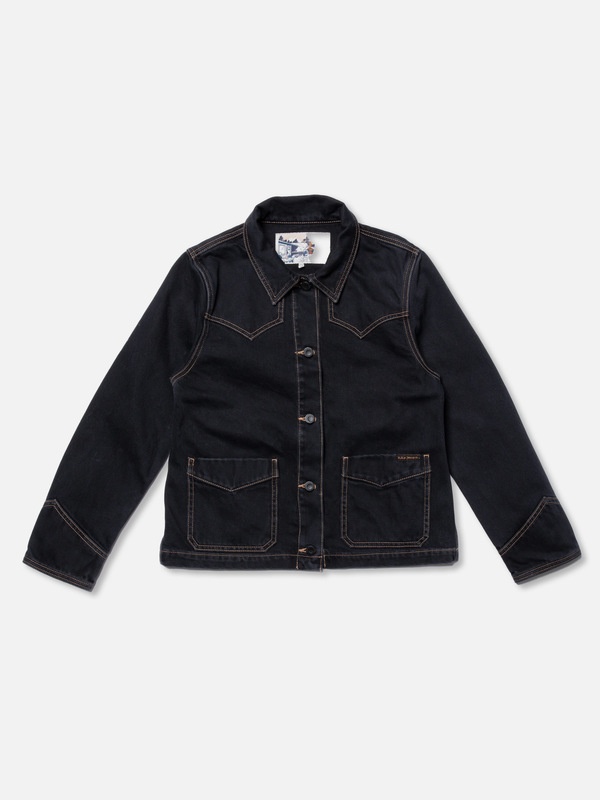 With a wear, tear, and repair philosophy, Nudie Jeans Co cherishes well-worn and mended styles, transforming everyday denim into personalised, enduring classics. Offering up saloon style, the Kelly Western Denim Jacket draws inspiration from ranch wear, featuring pointed shotgun cuffs, a pointed back yoke, and single-point front yokes in a slightly fitted, shorter cut. Crafted from coarse black denim, it has been delicately washed for a subdued hue and intricate detailing. - 100% Organic Cotton - Contrast Stitching - Jacron Patch - 2 Front Flap Pockets