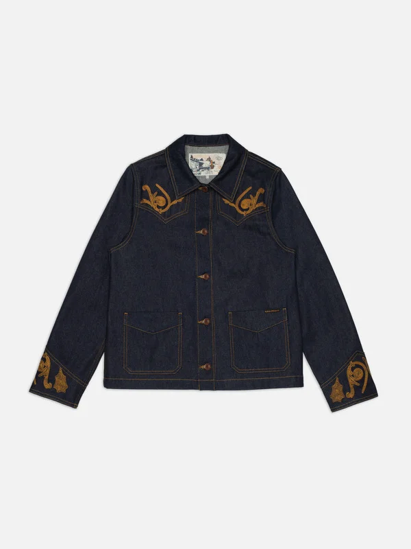 Details - Organic cotton - 12.5 oz. rigid denim - Tobacco thread at seams - Vintage-inspired copper trims - Woven label - Regular fit Kelly is a regular-fit, slightly cropped jacket with a sharp, structured silhouette—defined by its intricate embroidery. Inspired by the architectural details of our headquarters—an 1867 Neo-Renaissance building that once housed a grand bank, now cluttered with worn-out denim, dusty furniture, and the occasional essential whatnot—the embroidery reinterprets its ornate columns, decorative moldings, and intricate motifs into bold, western-inspired stitchwork. Stitched in tobacco-colored denim thread, it spans the cuffs, back, and front yoke, blending old-world opulence with ranch-wear tradition. Built with classic western elements, Kelly features pointed, overlaid single-piece cuffs, a defined back yoke, and single-point front yokes. Cut from tightly woven, saturated mid-blue denim, it will age beautifully, revealing pronounced twill lines and a subtle salt-and-pepper texture over time. A contrast of worlds—ornamental embroidery on no-nonsense denim. Just like us, settling into a space far too grand for a bunch of denim obsessives. Somehow, it definitely works.