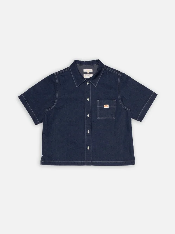 Lina is a short-sleeved denim shirt with regular fit and clean, straight cut. It features a patch-on chest pocket and side seam slits. Details - Organic cotton - 11.8 oz rigid 2/1 denim - Off-white thread allover - Logo label - Regular fit 100% Cotton Made in TN Lina is a short-sleeved denim shirt with regular fit and clean, straight cut. It features a patch-on chest pocket and side seam slits. Crafted from our "Painter Denim," a deeply saturated pure indigo 2/1 denim, Lina is stitched with contrasting off-white thread that delivers an authentic vintage workwear aesthetic. The rinse wash softens the rigid denim, enhancing comfort while maintaining the rich, deep mid-blue shade. A truly vintage-inspired workwear denim reimagined in a modern fit.
