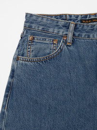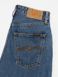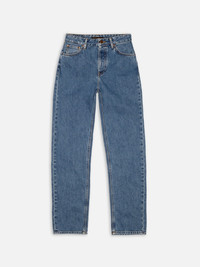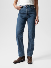 Regular-fit jeans with straight leg and high waist in muted mid-blue stonewash. Made with organic cotton rigid denim, featuring tobacco thread and copper trims. Details - Organic cotton - 14.9 oz. rigid denim - Tobacco thread at seams - Copper trims - Button fly - Jacron patch - Regular fit - High waist - Straight leg - Regular leg opening 100% Cotton Made in TN Regular-fit jeans with a straight leg and a high waist, in a beautifully muted mid-blue stonewash. The subtle grayish undertone and rustic ring-spun texture give these jeans a character that's hard to define, yet impossible to ignore. It could be the muted mid-blue hue, the flat yet textured surface, or the perfect contrast between highs and lows. In truth, it's the balance of all these details that makes this stonewash truly exceptional.