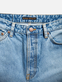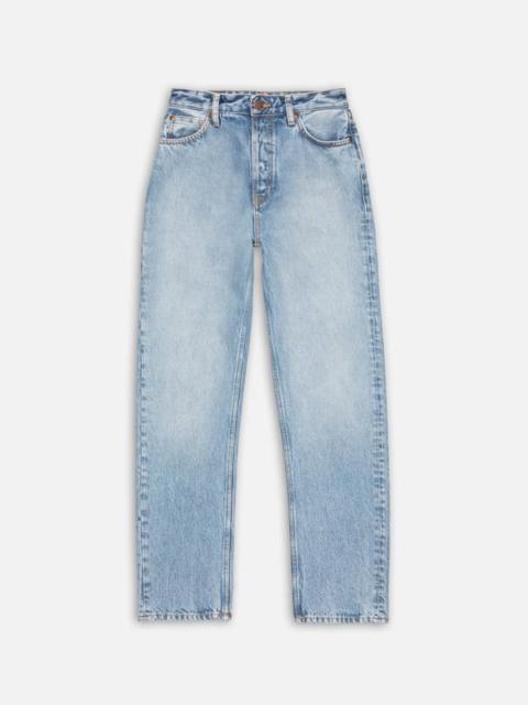 A regular-fit with straight leg, and a high waist in a mid-blue vintage wash. Made from organic cotton. Size & Fit Model is wearing size: W26''L30'' Model's height: 176 cm / 5'9'' Details - Organic cotton - 14.9 oz. rigid denim - Tobacco thread at seams - Indigo back pocket embroidery - Copper trims - Button fly - Jacron patch - Regular fit - High waist - Straight leg - Regular leg opening 100% Cotton Made in TN A regular-fit with straight leg, and a high waist in a mid-blue vintage wash. It is textural satisfaction to the fullest - pronounced marble effect at the darker areas that transition into smooth, worn areas that highlight the vintage of our dreams.