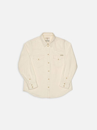 Lotta is a regular-fit denim shirt with a Western-inspired design, presented in a perfect off-white "Ivory" hue. Though minimalist in appearance, this shirt carries an unexpected depth of character. Details - Organic cotton - 13.1 oz rigid denim - Off-white thread allover - Faux pearl snap buttons - Regular fit 100% Cotton Made in TN Lotta is a regular-fit denim shirt with a Western-inspired design, presented in a perfect off-white "Ivory" hue. Though minimalist in appearance, this shirt carries an unexpected depth of character. Crafted from undyed organic cotton, the ring-spun denim features irregular yarns with subtle slubs, creating a delicate marble texture and unique imperfections that set it apart. The slightly contrasting stitching and faux pearl snap buttons add a refined touch. This white denim shirt embodies simplicity at its finest—clean, understated, yet full of rich denim texture.
