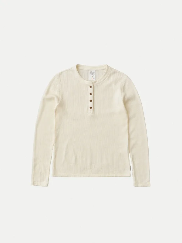 Regular fit long-sleeve henley in organic cotton waffle knit. Details - Organic cotton - Corozo buttons - Regular fit 100% Cotton Made in PT Long-sleeve henley neck tee made in a soft organic cotton waffle knit. Four-button placket with corozo buttons in a warm tobacco color.