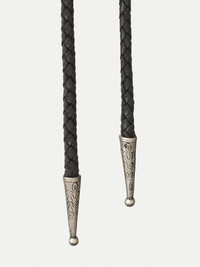 Bolo tie made from vegetable-tanned leather strips that have been braided to a cord. Details - Braided genuine leather cord - Vegetable tanned - Metal buckle and tips - Length 52 cm 100% Leather Made in PL Bolo tie made from vegetable tanned leather strips that has been braided to a cord. The ornament clasp and the tips are engraved with a mismash of traditional and kurbits-like patterns.