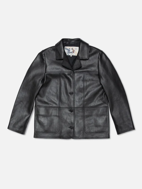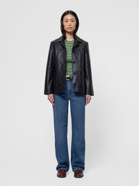 Blazer crafted in black, supple goat leather. Regular fit. Size & Fit Model is wearing size: S Model's height: 175 cm / 5’8” Details - Semi-vegetable tanned goat leather - Corozo buttons - Lining in 50% recycled polyamide/50% organic cotton - Regular fit 100% Leather Made in IN Smart blazer crafted in black supple goat leather. It's fully lined with black lining from recycled cotton and polyamide. On the inside you also find one pocket for personal belongings. When you buy this jacket, you can be sure we have paid our share of living wages.