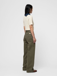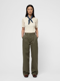 Regular fit pleated sailor pants with a high waist and wide leg, crafted from exquisite herringbone twill. Size & Fit Model is wearing size: W26" L32" Model's height: 175cm / 5’8” Details - Organic cotton - Rigid herringbone twill - Matching thread at seams - Turtoise button - Zip fly - Four pockets - Woven patch - Regular fit - High waist - Wide leg - Wide leg opening 100% Cotton Made in TN Introducing Suki – our Pleated Sailor Pants. Designed with a high waist and wide leg, these pants boast an artful workwear aesthetic. Crafted from exquisite herringbone twill, the fabric is tightly woven, giving it a slightly crisp texture, a dry feel, and a smooth appearance. The pattern of the fabric pays homage to vintage herringbone twills, and to ensure longevity and desirable aging properties, we have piece-dyed it in a lovely olive shade. After a gentle wash, the fabric's characteristics and garment construction are subtly accentuated. For the complete look, pair Suki with our Bibbi jacket. Curious to learn more about herringbone twill? We're delighted you asked! Herringbone twill is a variation of the regular twill weaving pattern. While regular twill, as seen in denim, exhibits a distinct diagonal pattern, herringbone twill features broken diagonal lines, creating a noticeable zig-zag pattern (more prominent than in a broken twill). The zig-zag pattern, resembling the bone structure of a herring, is compact yet distinctive. Herringbone twill is commonly found in vintage workwear jackets, particularly those of French and German origin, often in blue or grey hues. Moreover, it is well-known for its usage in vintage military fatigues, commonly referred to by its acronym HBT. The choice of herringbone twill in workwear and military garments can, to our knowledge, be attributed to two primary reasons. Firstly, the alteration of the twill direction enhances tear resistance. Secondly, during a time when sanforization and skewing processes were not yet developed, herringbone twill exhibited a reduced tendency to skew compared to regular twill. This aspect, similar to the purpose behind the development of broken twill, contributed to its popularity. There you have it, the ins and outs of herringbone twill.