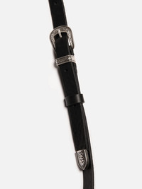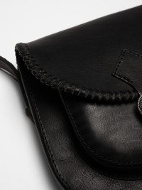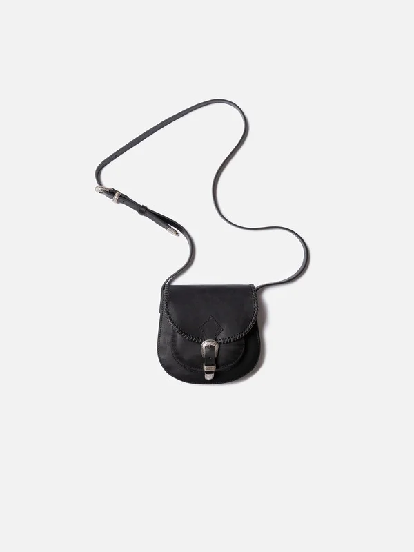 Western-style saddle bag, designed to accommodate life's essentials. Details - Vegetable-tanned full-grain leather - Metal buckle and tips 100% Leather Made in PL Western-style saddle bag, designed to accommodate life's essentials. Meticulously crafted from pitch-black vegetable-tanned full-grain leather, it boasts a rich, subdued black hue and a delightful texture. Ornamented metal detailing further enhances its Western flair. Much like denim, leather develops a unique patina as it ages. This saddle bag is no exception and will only grow more beautiful with time.