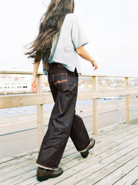 Loose, low-waist fit with a wide leg, made from 13.75 oz. Kaihara selvage denim. Tightly woven with slubby yarns and an orange selvage ID line. Made from organic cotton. Details - Organic Cotton - 13.75 oz. rigid selvage denim from Kaihara, Japan. - Greencast denim - Orange thread on all seams - Antique silver trims - Zip fly - Jacron patch - Loose fit - Low waist - Wide leg - Wide leg opening 100% Cotton Made in IT A loose, low-waist fit with a wide leg made in our heritage selvage denim, the 13.75 oz. Kaihara selvage that has been with us since 2001. A fabric with the potential to become the greatest looking pair of jeans you ever put on. The fabric is tightly woven and has a right-hand construction with slubby yarns. It has an orange selvage id line, a feature made exclusively for us. We recommend 6 months of hard, every day, wear before the first wash, if not longer. This way you will end up with a beautiful pair of worn-in jeans. It sure is a long time, however, it's only a recommendation. As long as you give them love, the result will be great.