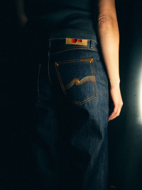 Details - Regenerative Organic cotton - 14.2 oz. rigid denim - Orange thread at seams - Sunburns gradient back pocket embroidery - Copper trims - Jacron patch - Zip fly - Jacron patch - Loose fit - Low waist - Wide leg - Wide leg opening Wide Heidi Dry Sunburns makes its mark with a bold gradient back pocket embroidery, shifting from deep orange to pale yellow, with our own Nudie Jeans Orange at the center. Paired with a special graphic Jacron patch, it subtly plays with our identity and iconography. Beneath it all lies a proprietary 14.2 oz denim, developed exclusively for Nudie Jeans. Woven with Regenerative Organic Cotton, it revives the raw, textured character of a pair of ‘90s jeans we once stumbled upon. Though undeniably "modern," these jeans are rooted in a transitional era—a time when vintage ring-spun textures resurfaced, and select denim mills strayed from pure efficiency in pursuit of true vintage aesthetics. A defining moment—just before Nudie Jeans was born. The wide-leg, high-waist silhouette of Wide Heidi brings a sense of effortless volume, reinforcing the denim’s sturdy, substantial feel. Stiff and unapologetic in its raw form, it breaks in with deep creases and sharp wear marks, gradually revealing the full depth of its warp streakiness. Over time, the interplay of slub, clean twill lines, and subtle marbling comes into its own—a denim built to become tomorrow’s vintage.