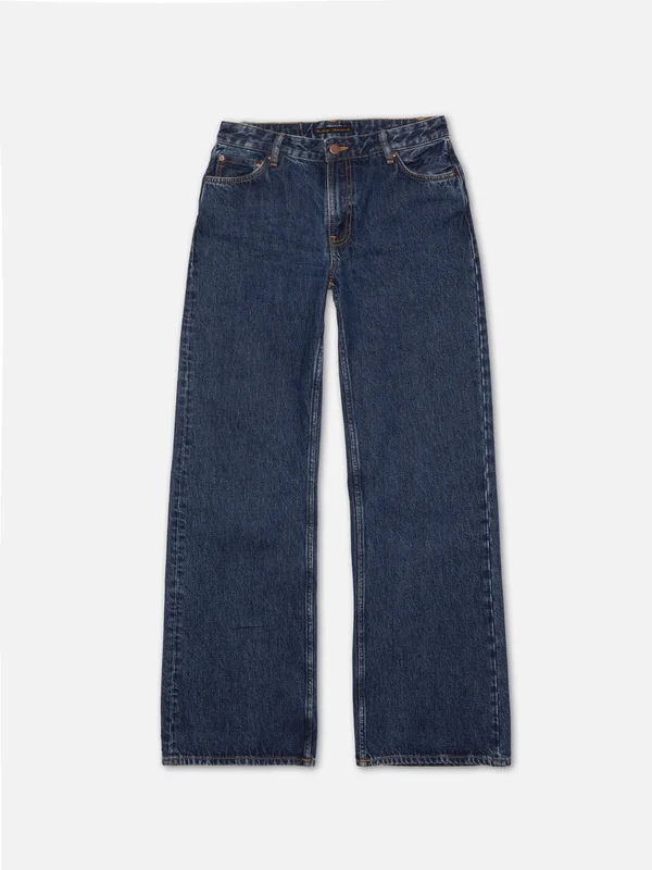 A loose, low-waist fit with a wide A-line leg in a soft, dark blue stonewash reminiscent of the 00's. Size & Fit Model is wearing size: W26" L32" Model's height: 175 cm / 5’8” Details - Organic and recycled cotton - 12.75 oz. rigid denim - Tobacco threads at seams - Copper trims - Zip fly - Jacron patch - Loose fit - Low waist - Wide leg - Wide leg opening 100% Cotton Made in TN A loose, low-waist fit with a wide leg in a soft, dark blue stonewash. The wash displays a wonderful blend of textures and muted dark indigo hues. Seams provide a highlighting detail, and a subtle marbling texture adds depth and further detail, giving this plain stonewash the authentic, deep indigo stonewashed look of the '00s.