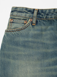 Details - Regenerative Organic cotton - 14.2 oz. rigid denim - Orange thread at seams - Copper trims - Zip fly - Jacron patch - Loose fit - Low waist - Wide leg - Wide leg opening A loose, low-waist fit with a wide leg, crafted in the astonishing Golden Drift wash. Washed to a pale, sun-faded hue with a warm golden tint, it carries a worn-in character that balances dusted-down rawness with effortless refinement. Faded streaks and textured highs and lows add depth to the pale indigo base, shifting from streaky grain to subtle marbling. The result is a wash that feels elevated—a sun-bleached drift through golden light.