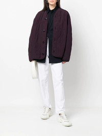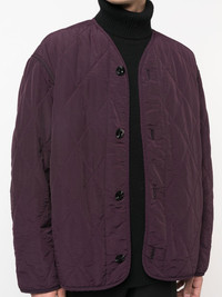Liner short padded collarless jacket Highlights - Purple - Padded design - Collarless - Front button fastening - Long sleeves - When buying this unisex item, keep in mind that it is graded in standard men's sizing. Made in Italy Composition Lining: Polyester 100% Outer: Polyamide 58%, Polyester 42% SIZE & FIT Model measurements Height 5 ft 10 in(1.78 m) Bust/Chest 31.49 in(80 cm) Hips 36.22 in(92 cm) Waist 25.59 in(65 cm) FittingInformation This piece is unisex. Please take care when selecting your size Designed for a loose fit for men and an oversized fit for women Made with a mid-weight non-stretch fabric Washing instructions Machine Wash