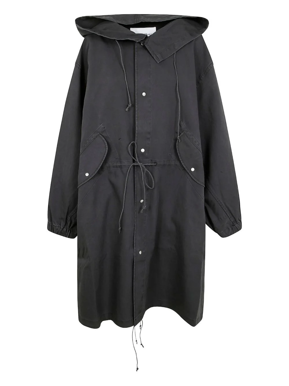 pressed-stud coat Highlights - Black - Front press-stud fastening - Two front flap pockets - Slouchy hood - Long sleeves Imported Composition Cotton 100%