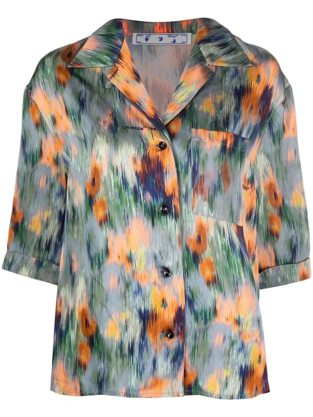 abstract-print bowling shirt Blending different hues into a vibrant abstract print, Off-White presents this bowling shirt as a lively part of their AW21 offering. This spirited design is cut in a relaxed fit and designed with dropped shoulders for a laid-back feel. Made in Italy Composition Viscose 100% Washing instructions Dry Clean Only