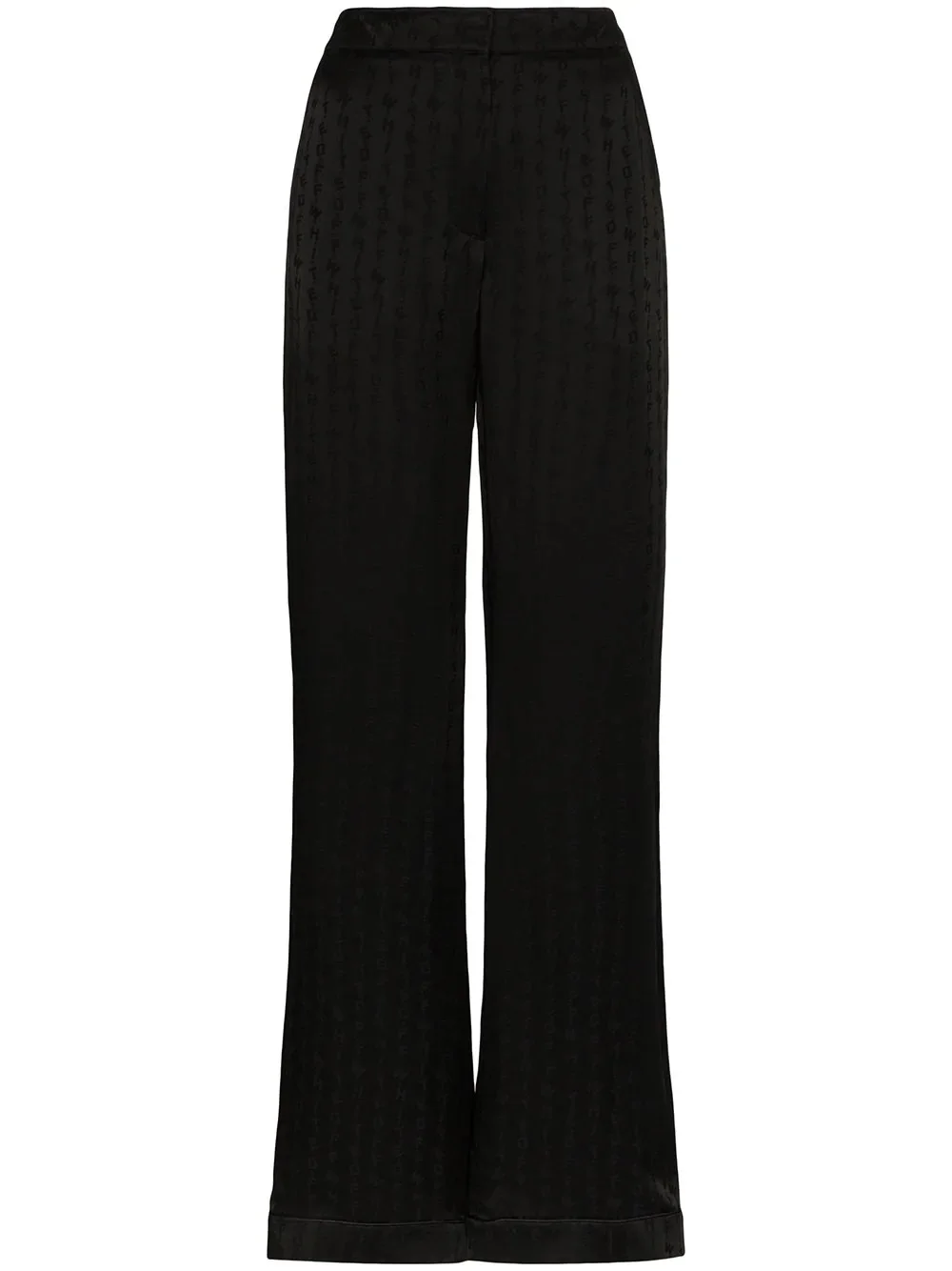 alphabet-print wide-leg trousers What does your style say about you? Spell it out with these black high waist wide leg trousers from Off-White that on closer inspection are adorned with an alphabet pattern striping down the garment. This is easily a great look like a,b,c. Featuring an elasticated waistband, side pockets, a long length, turn-up cuffs and rear pockets. Made in Italy Composition Lining: Polyester 100% Outer: Acetate 53%, Viscose 47% SIZE & FIT Model measurements Height 5 ft 11 in(1.8 m) Bust/Chest 31.49 in(80 cm) Hips 35.43 in(90 cm) Waist 24.4 in(62 cm) FittingInformation This piece fits true to size. We recommend you get your regular size Designed to be fitted at the waist and hips, loose over the leg Made with a mid-weight non-stretch fabric Washing instructions Hand Wash