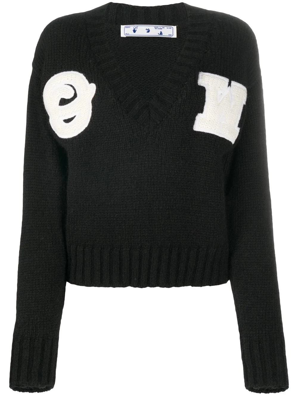 appliqued alpaca and wool-blend jumper Channel your inner jock with OFF-WHITE's jumper. Aside from making you feel like the captain of the football team, it's blended with alpaca and wool to keep you nice and warm. Two birds, one stone. Highlights - Black - Alpaca-blend - Round neck - Applique detailing - Ribbed detailing Made in Italy Composition Alpaca Wool 68%, Polyamide 22%, Wool 10%