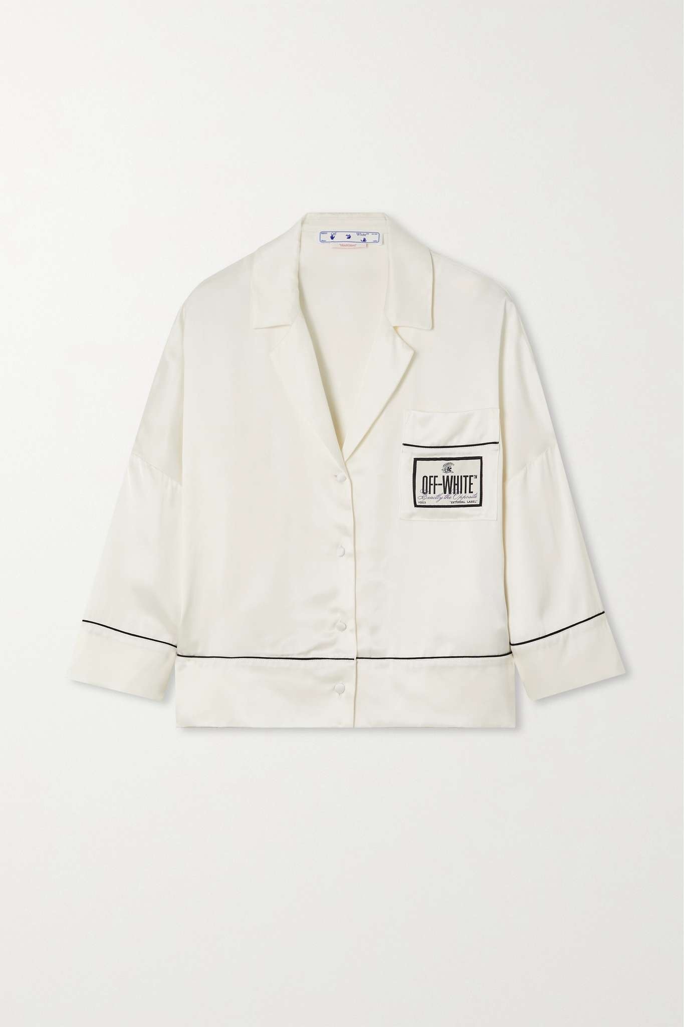 EDITORS'NOTES Off-White's shirt is cut from slinky satin that's contrasted with black piping. Inspired by traditional pajamas, it's cut to a boxy fit and detailed with a notched collar. The front pocket is accented with the label's logo appliqué. SIZE & FIT - Fits true to size, take your normal size - Designed for a boxy fit, cut to be worn loose - Lightweight, fluid, non-stretchy fabric - Model is 177cm/ 5'10" and is wearing an IT 40 DETAILS & CARE - White and black satin - Button fastenings through front - 100% viscose - Dry clean