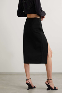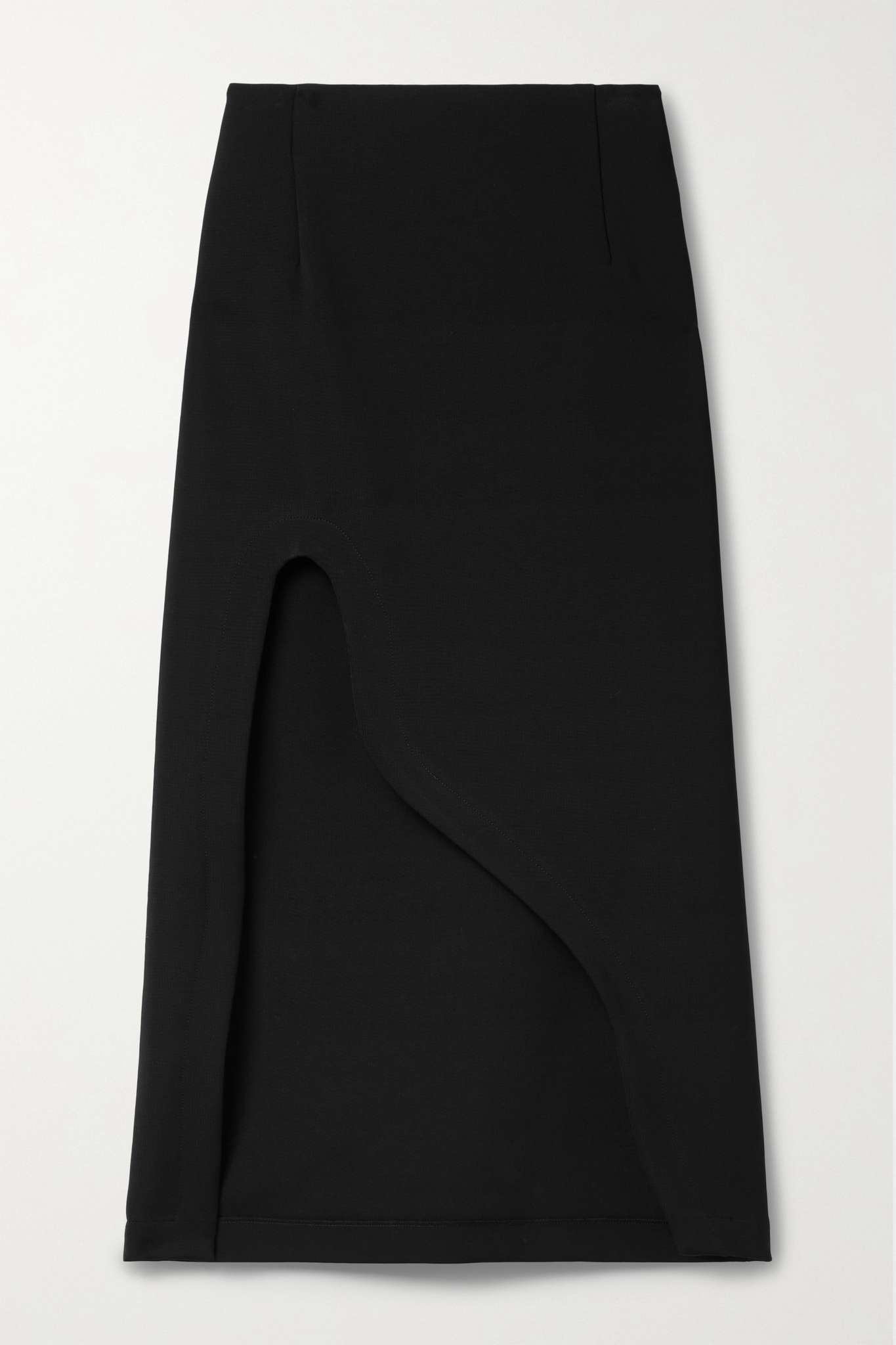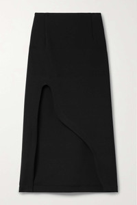 EDITORS'NOTES Off-White's pieces are never short of cool, unexpected touches. Otherwise simple, this skirt is designed with a uniquely curved split that reveals a flash of leg. It's made from black ponte and has a darted, high-rise waist. Wear yours with a cropped blazer or tucked-in blouse. SIZE & FIT - Fits true to size, take your normal size - Falls below the knee, designed to be worn at the waist - Mid-weight, stretchy fabric - Model is 180cm/ 5’11” and is wearing an IT 40 DETAILS & CARE - Black ponte - Concealed hook and zip fastening at side - 86% viscose, 10% polyamide, 4% elastane - Dry clean