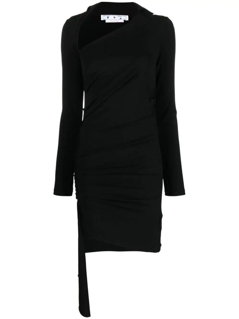 OFF-WHITE WOMEN asymmetric ruched minidress asymmetric ruched minidress from OFF-WHITE featuring black, stretch-jersey, ruched detailing, draped design, asymmetric neck, long sleeves and thigh length. Made in Italy Composition Viscose 95%, Elastane 5% Washing instructions Hand Wash Wearing The model is 1.75 m wearing size 40