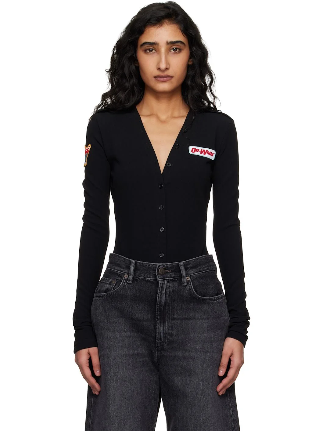 Stretch viscose-blend jersey bodysuit. · Button hardware at V-neck · Button closure · Embroidered logo patch at chest and sleeve · Epaulets Supplier color: Black 61% viscose, 33% polyamide, 6% elastane. Made in Italy 261607F358001
