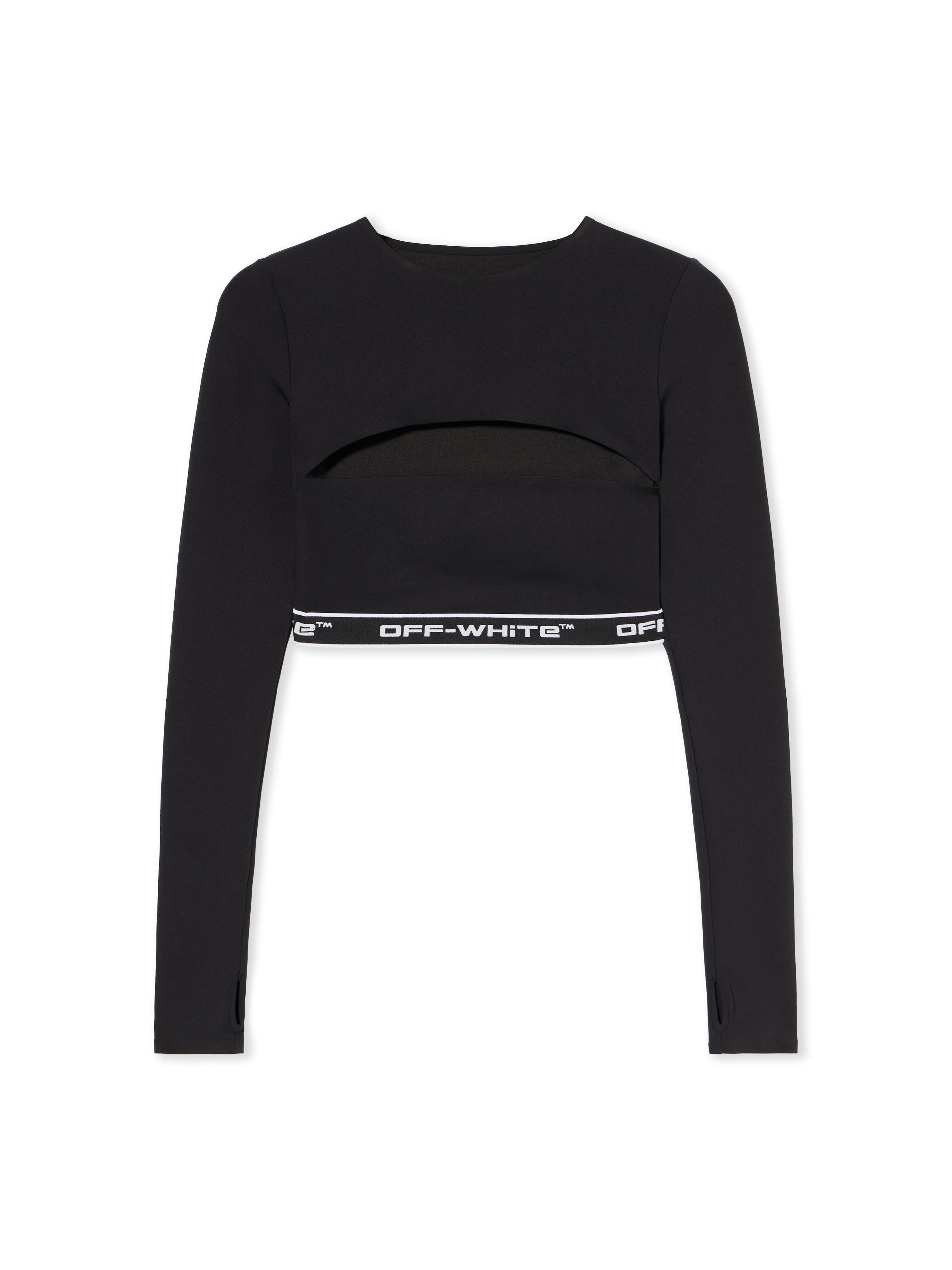 Discover the architectural precision of the Logoband Cut Out Top, a refined synthesis of urban style and technical innovation, featuring a signature cut-out design and distinctive branding. - Structured long sleeves with thumbhole detailing - Front cut-out design for a bold statement - Elastic logo band underbust for support - Signature Off-White™ branding at rear - Minimalist aesthetic with high-impact visual elements DETAILS - Material: 14% Elastane 86% Polyamide (Nylon) - Code: OWVB04CF25JER0011032