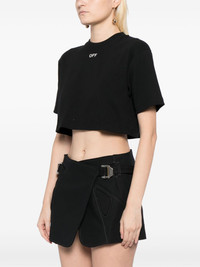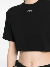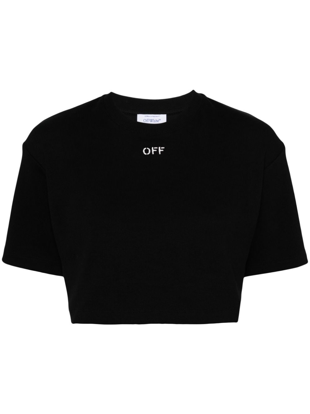 Off-embroidered ribbed t-shirt Highlights - Black/white - Cotton blend - Ribbed knit - Embroidered logo to the front - Ribbed band collar - Crew neck - Drop shoulder - Short sleeves - Cropped - Straight hem Made in Italy Composition Body: Cotton 98%, Elastane 2% SIZE & FIT Model measurements Height 5 ft 9 in(1.76 m) Bust/Chest 31.49 in(80 cm) Hips 36.61 in(93 cm) Waist 24.4 in(62 cm) FittingInformation Designed for a slim fit that sits just away from the body offering a close yet comfortable fit Cropped in length Made from a midweight stretch fabric, this piece offers elasticity and flexibility when worn This piece fits true to size – take your usual size