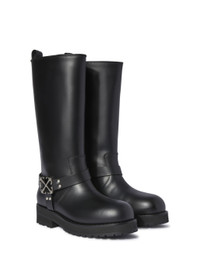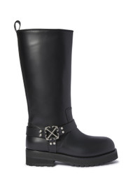 black leather smooth grain slip-on style low stacked heel knee-high pull-tab at the heel harness detail signature Arrows plaque round toe branded leather insole leather lining chunky rubber lug sole MATERIALS Sole: 100% Rubber Outer: 100% Leather Lining: 100% Leather FITTING Bust 0cm Height 0cm Hips 0cm Waist 0cm