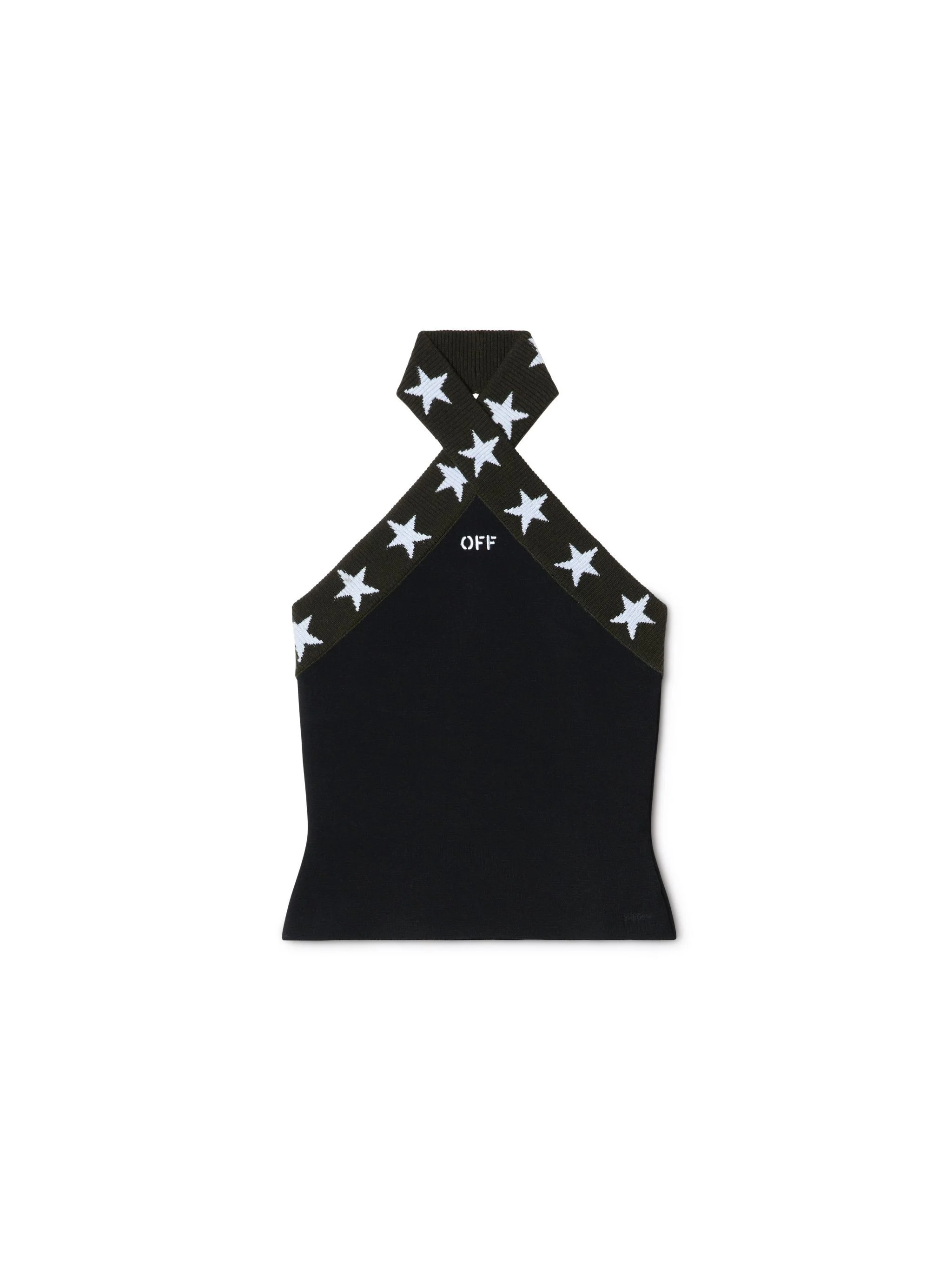 This fitted top is crafted from 100% cotton and features crossover halterneck straps with stars and a small stamp logo. Made in Italy. DETAILS - JUNI WEARS SIZE S HEIGHT: 5' 7” (176 CM) BUST: 28” (73 CM) WAIST: 23“ (60 CM) HIPS: 35” (89 CM) - Materials:Cotton 100% - Code: OWHT02HS25KNI0011042