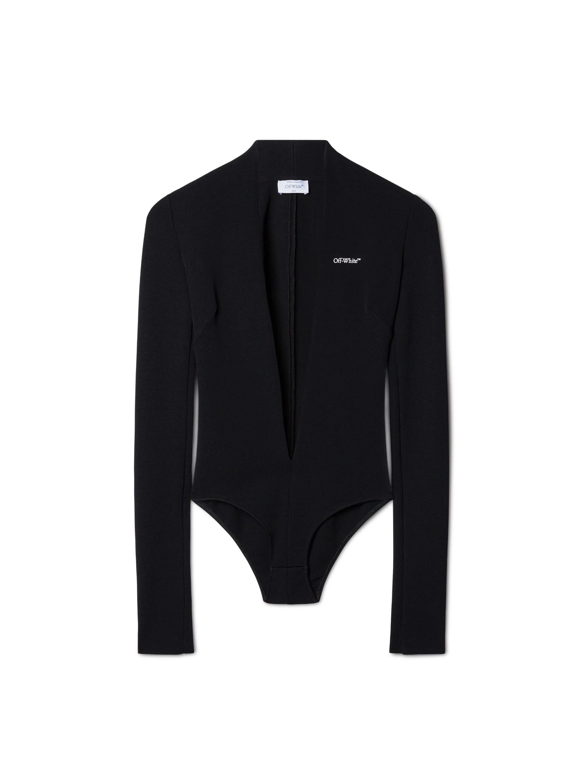Part of the SS25 "DUTY FREE" runway collection, this long-sleeved bodysuit features a deep plunge neck and is finished with a small bookish logo on the front and large zero-zero and small arrow charm on the reverse. Made in Italy. DETAILS - HANNAH WEARS SIZE 38 HEIGHT: 5' 9" (175 CM) BUST: 32” (82 CM) WAIST: 23“ (60 CM) HIPS: 34” (86 CM) - Elastane 6% , Nylon 33% , viscose 61% - Code: OWDD04EZ25JER0021001