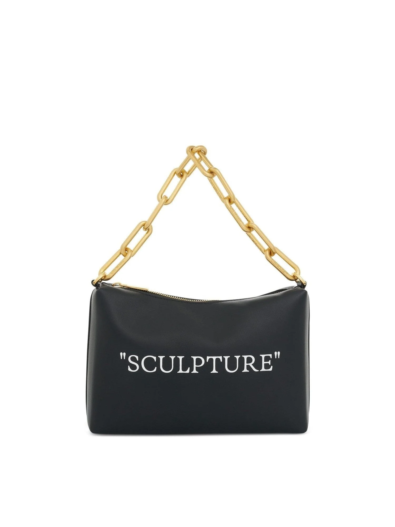 Elevate your style with this unique and modern Block Pouch Quote Bag in Black/White. Crafted with dynamic black and white blocks and defined by its eye-catching geometric design, this bag will make a bold statement on any occasion. - Composition: 100% Calf Leather - Slogan print to the front - Logo print to the rear - Top zip fastening - Main compartment - Internal slip pocket - Internal logo stamp - Gold-tone hardware - Chain-link shoulder strap (15 cm) - Dimensions: 16 (H) x 21 (L) x 7 (W) cm SKU: OWNM045F23LEA0011001